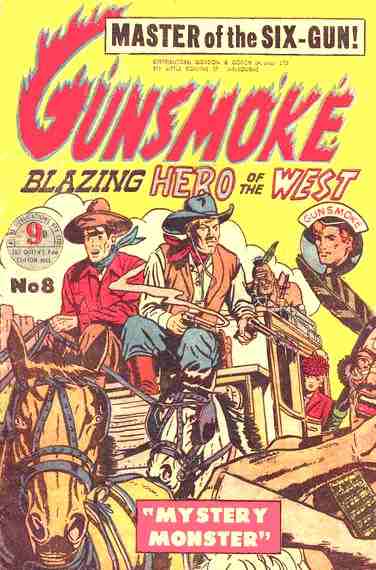 The series premiered in 1954. Stopped in 1955 after 8 issues. The series contains diverse stories from the Wild West. The full title of the series is Gunsmoke Blazing Hero of the West. It is not related to the popular American TV and comic book series named Gunsmoke. |